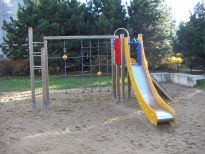 Vybavení: pískoviště, prolézačka se skluzavkou a tyčí, pružinová houpačka (motorka), 2 závěsné houpačky