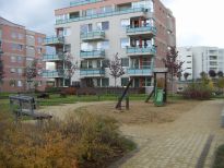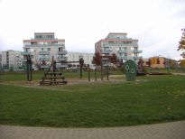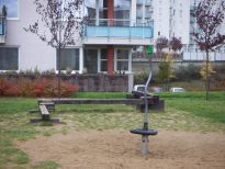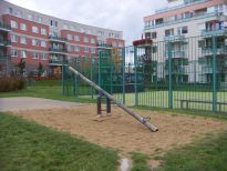 kladinová houpačka, asfaltový plácek, oplocený prostor pro míčové hry