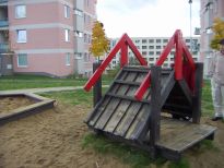 dřevěná prolézačka, hrazdy, stěna na lezení, pružinová houpačka (motorka) pískoviště, most + domek